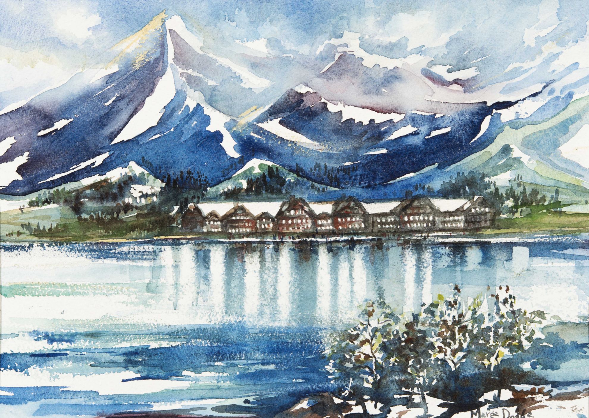 Name: "Many Glacier Hotel, Glacier National Park, Montana"Price: $1000.00SKU: 7191Date Created: Art Dimensions: 10" x 14" Frame Dimensions: Medium: WatercolorSigned: YESColors: Notes: Another redetion capturing the beauty of Glacier National Park.