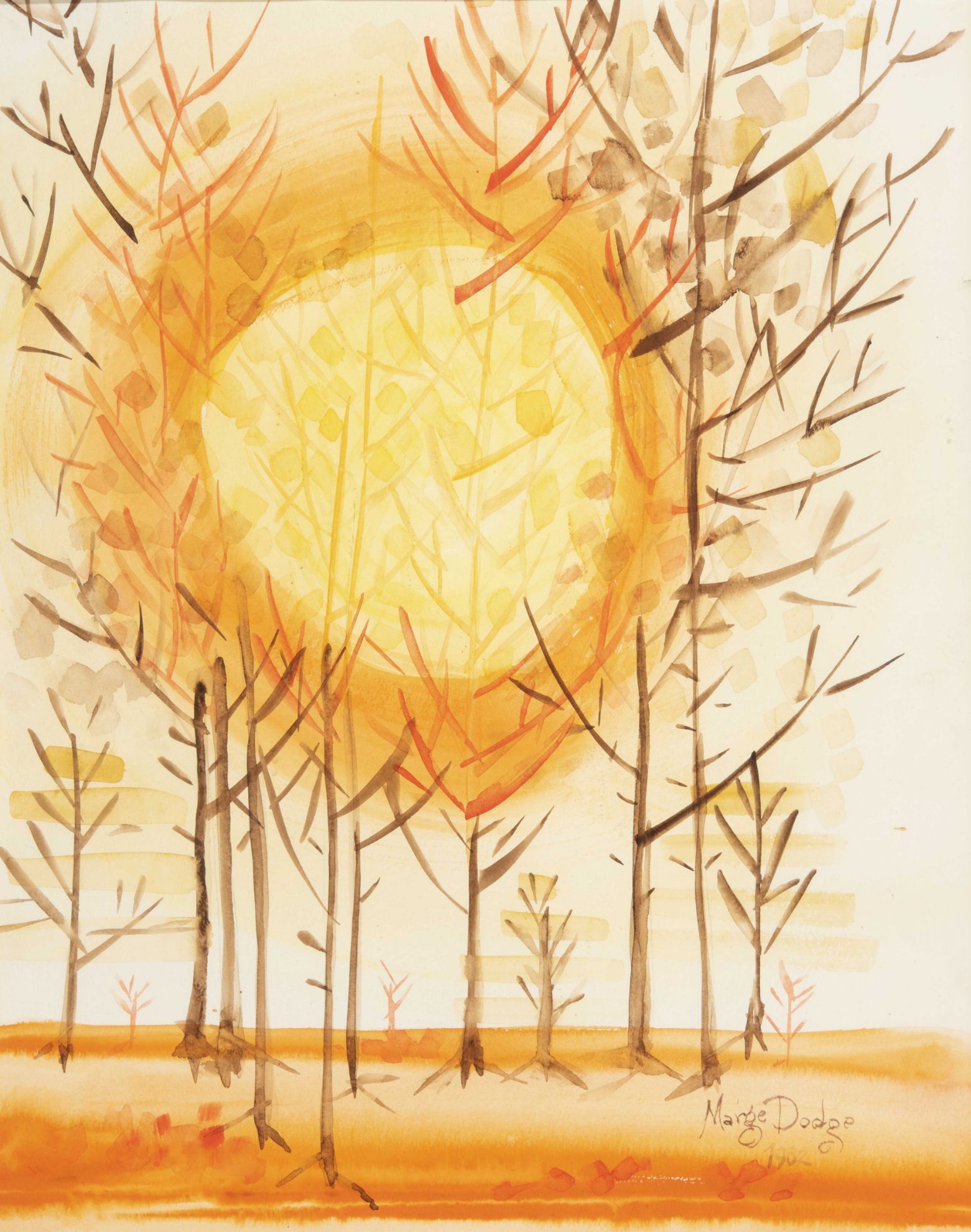 Name: "Trees Thesis series: Orange Trees and the Sun"Price: $4500.00SKU: 7217Date Created: 1962Art Dimensions: 17" x 21.5" Frame Dimensions: 27" x 32"Medium: WatercolorSigned: YESColors: Notes: See: Trees These Series. Orange Abstract #1 one sun...