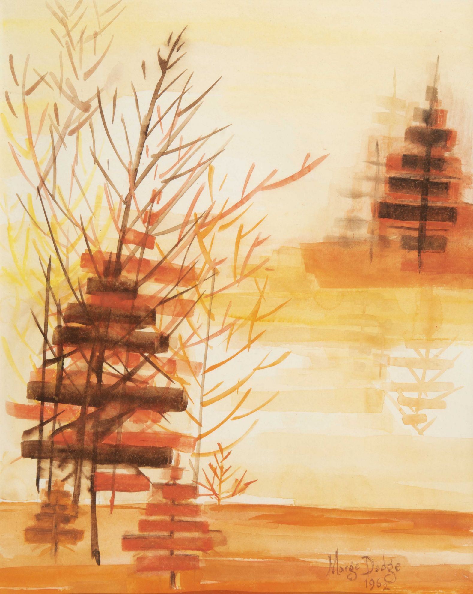 Name: "Trees Thesis series: Orange Trees Falling"Price: $4500.00SKU: 7218Date Created: 1962Art Dimensions: 17" x 21.5" Frame Dimensions: 27" x 32"Medium: WatercolorSigned: YESColors: Notes: See: Trees These Series. Orange Abstract #2 two trees...